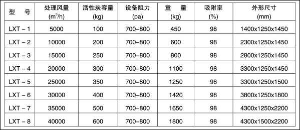 LXT型廢氣活性炭凈化器可以改變內部的填充物從而達到處理不同種類的廢氣。例如廢氣苯類、酚類、醇類、醚類、酊類等。濃度低于1000mg/m3的廢氣經過凈化器處理之后均能達到GB16297-1996《大氣污染物綜合排放標準》的要求。
