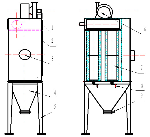 序號 名稱 序號 名稱 1 上門 6 風機 2 下門 7 濾芯 3 進風口 8 調節杅 4 灰斗 9 閘板 5 支腿